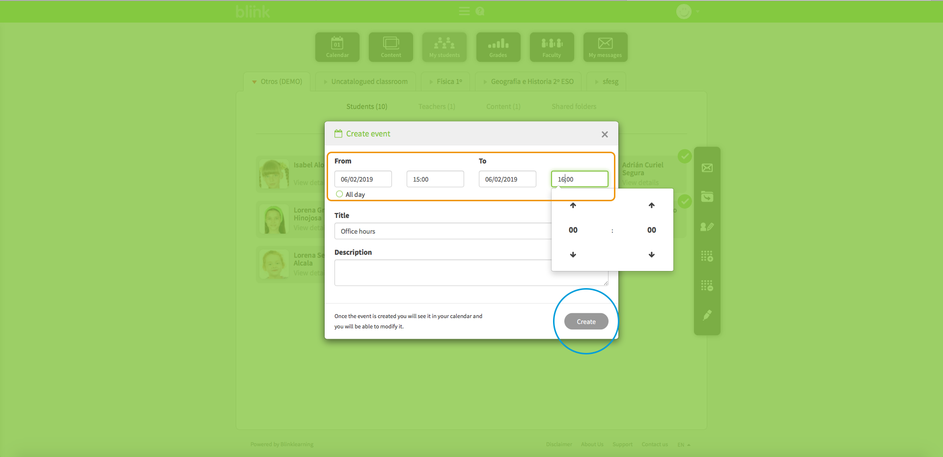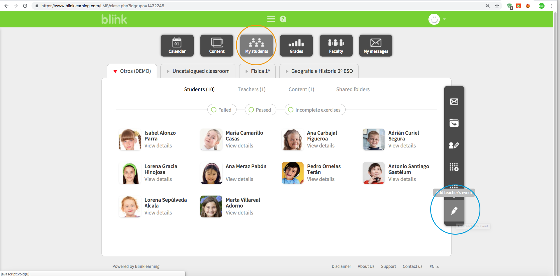 Teacher events appear in yours and in the calendars of all the students you select (if you do not select any, the event will be shown in the calendars of all students in the class). To create a Teacher Event, you must go to the MY STUDENTS tab and select the "Add event" icon.