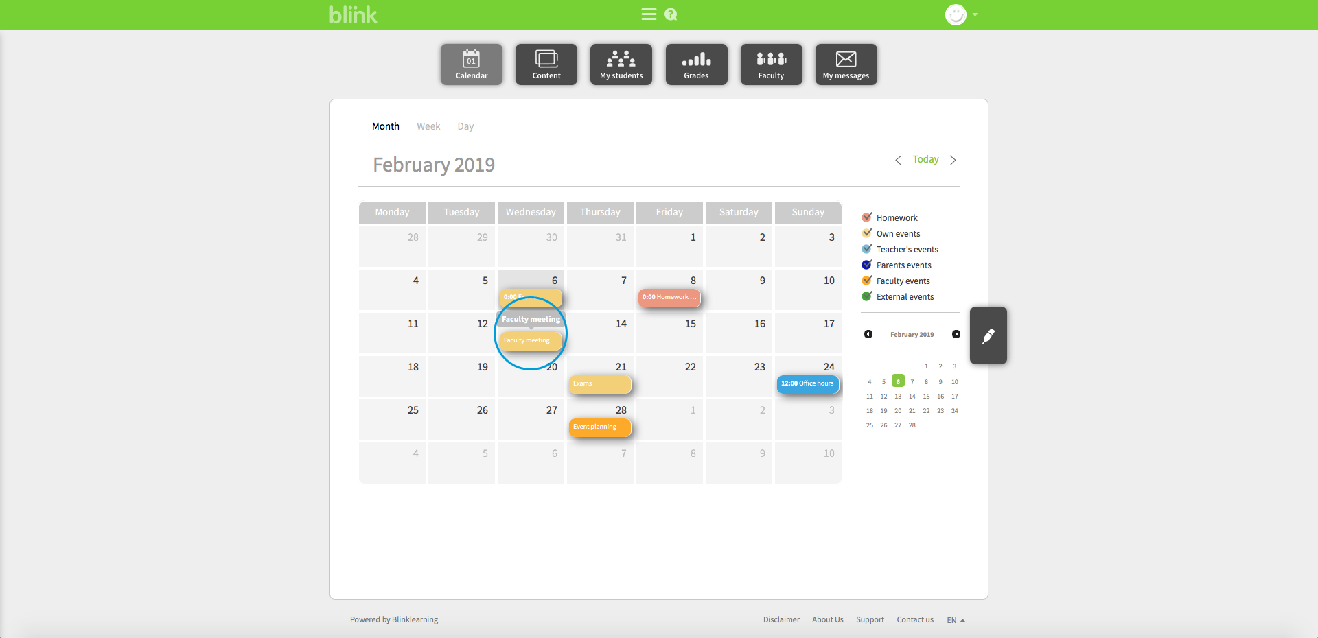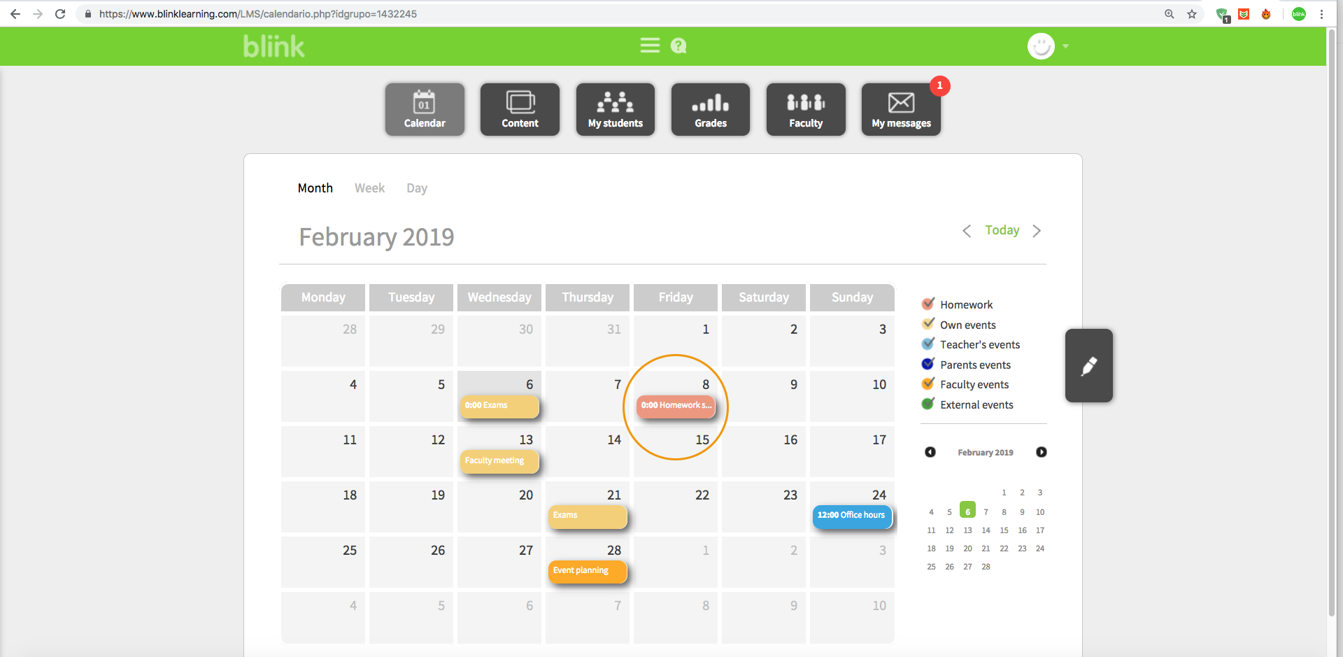 There are five different types of events: Homework, Own events, Teacher's events, Parents events, Faculty events and External events.