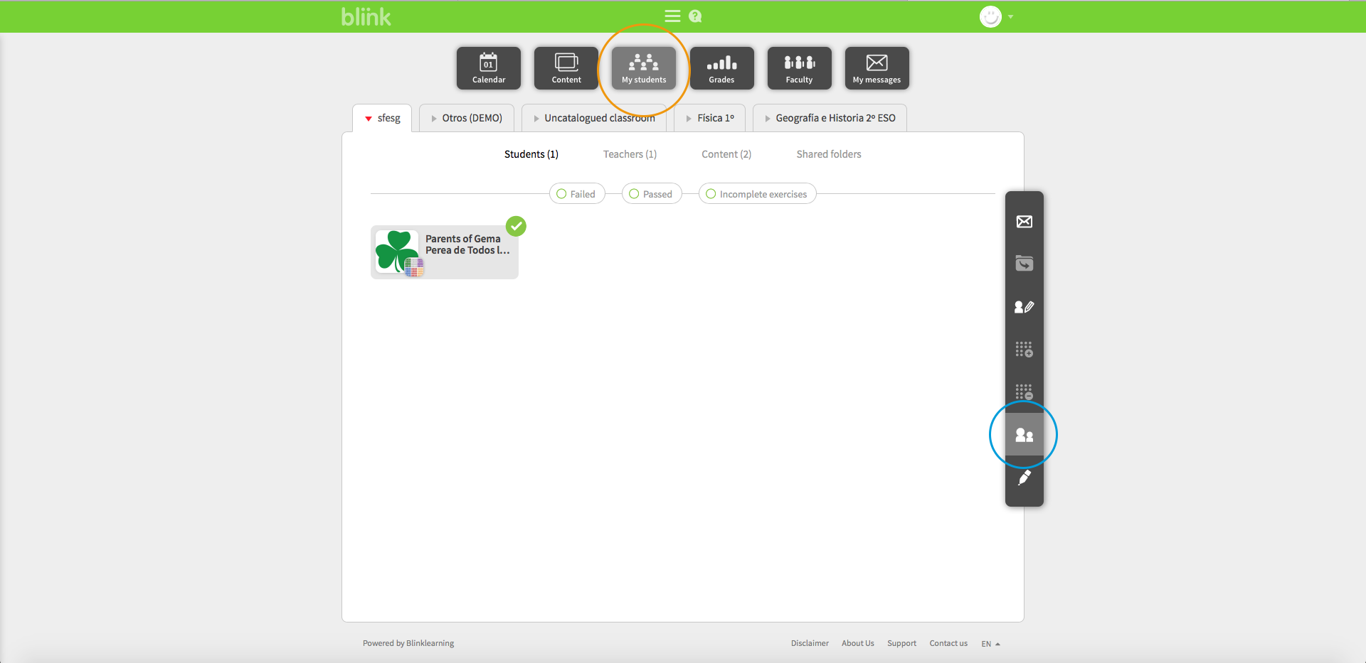 Parent events refer to events you schedule with your students' parents and appear in both yours and in the calendars of the parents you select (if you do not select any, the event will be scheduled for all parents in the class). To create a Parents event select the MY STUDENTS tab and click on the "See parents" icon on the side toolbar.