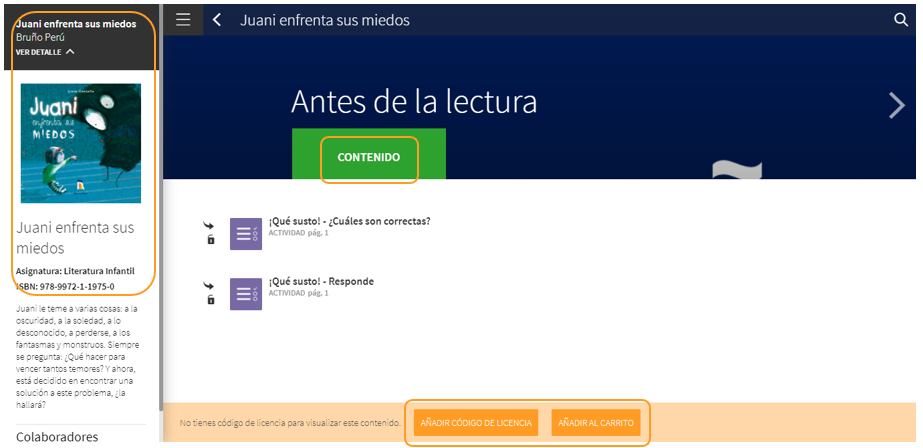 Para añadirlo, puedes hacerlo desde el botón + que indica Añadir código de licencia o entrando al libro y en la banda que indica el mensaje “No tienes código de licencia para visualizar este contenido”, haz clic en el botón AÑADIR CÓDIGO DE LICENCIA o en AÑADIR AL CARRITO si todavía no dispones de un código para ese libro.