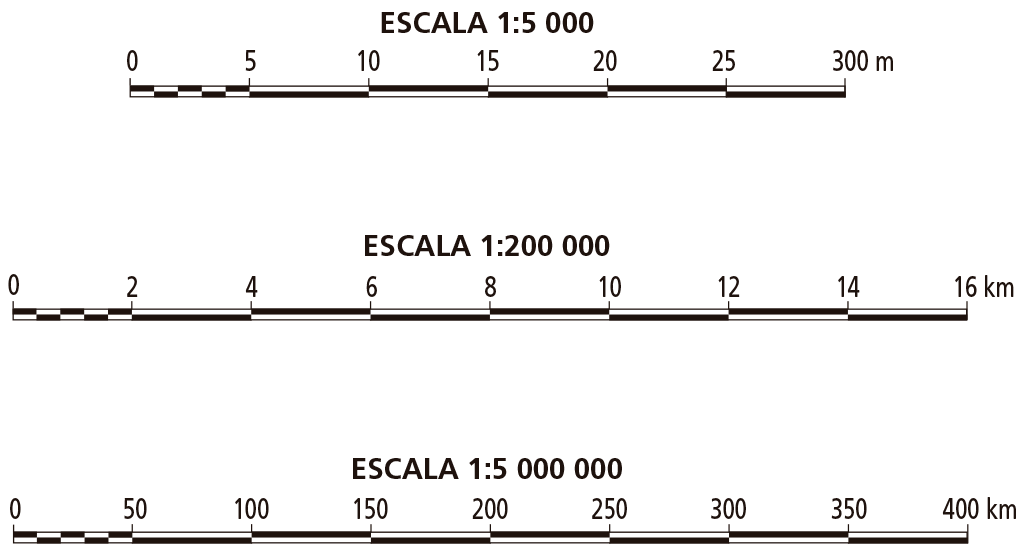 En un mapa 1:100 000, cualquier medida que tomemos en él (centímetros, milímetros, etc.) será en el terreno cien mil veces esa medida. Así, tenemos mapas de pequeña, mediana y gran escala. Cuando el denominador es grande, representamos grandes espacios pero pocos detalles; cuando el denominador es pequeño, el espacio representado es reducido pero muy detallado.