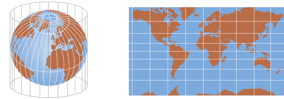 Consiste en rodear la Tierra con un cilindro, tomando como referencia la línea del Ecuador, y proyectar sobre él todos los elementos de la Tierra, realizando así un mapamundi.