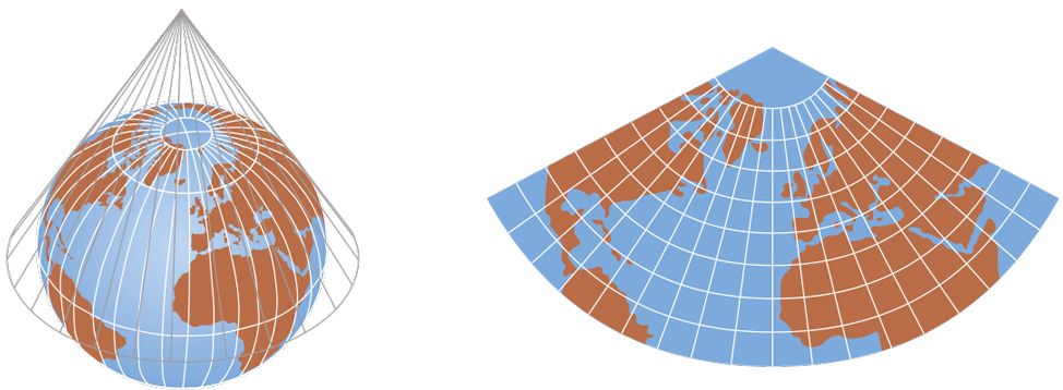 En las proyecciones cónicas, la Tierra se inscribe en un cono que al desplegarse forma un abanico. Los meridianos se convierten en líneas rectas que parten del polo y los paralelos adoptan la forma de circunferencias concéntricas. Tiene el inconveniente de que solo puede representarse un hemisferio.