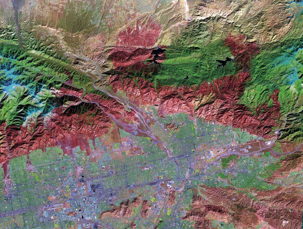 En octubre de 2003, un satélite de la NASA realizó esta imagen de un gran incendio al este de Los Ángeles (California). La imagen se envió inmediatamente al Servicio Forestal para ayudarlo a definir la gravedad de las áreas quemadas. El mapa combina datos de las regiones visibles y luces infrarrojas para resaltar las áreas quemadas. Su alta resolución proporciona a los científicos información crítica para el mapeo de la superficie, y el seguimiento de condiciones dinámicas y cambios atmosféricos.