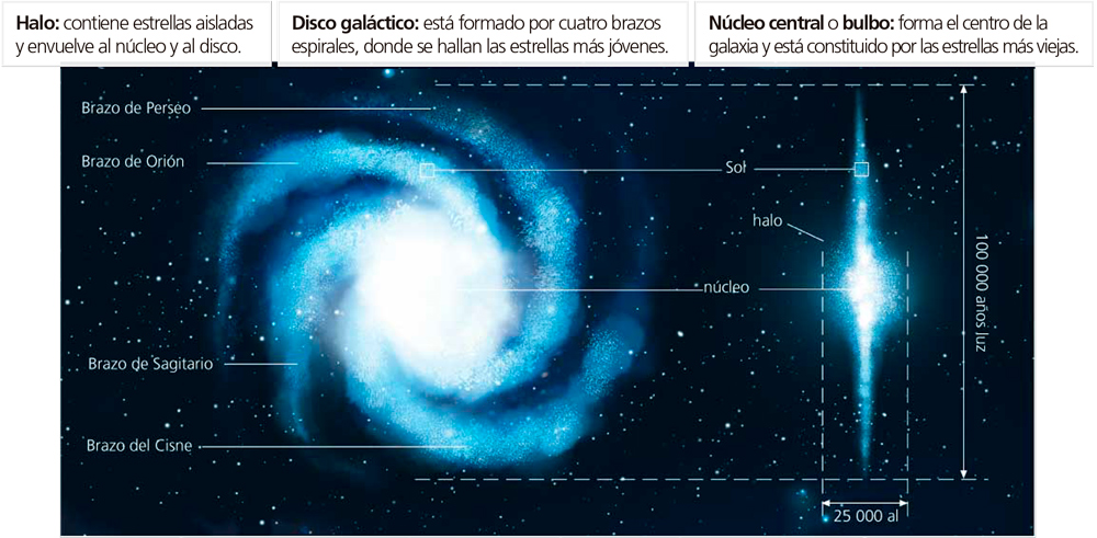 Formada por miles de millones de estrellas, la Vía Láctea presenta cuatro brazos, en uno de los cuales se halla el Sol. En ella se distinguen tres zonas: el núcleo, el disco galáctico y el halo.
