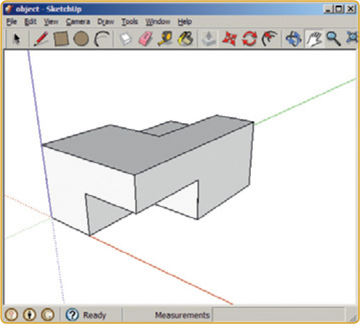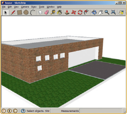 Es muy sencillo comenzar a dibujar edificios y volúmenes a los que puedes darle forma y aspecto a tu gusto. Observa cómo en el ejemplo hemos diseñado una nave industrial. Con la herramienta cuadrado hemos ido dando forma al exterior de la nave. Una vez asignadas las medidas externas, hemos procedido a fijar las ventanas y la puerta principal.