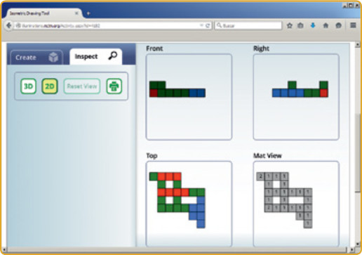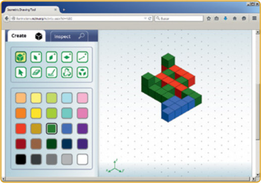 En esta web, dispones de una herramienta para practicar en el diseño de piezas directamente en perspectiva isométrica accediendo a la web http://illuminations.nctm.org. La pantalla se divide en dos partes. En la izquierda dispones de las herramientas para dibujar y de los colores para seleccionar, mientras que la derecha es el lienzo en el que dibujar sobre la rejilla isométrica. Por defecto, accedes en la opción de Crear (Create), pero una vez que finalices con el dibujo puedes hacer clic en la pestaña de inspección (Inspect) para comprobar las vistas del objeto según el alzado, la planta y el perfil.