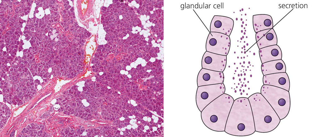 • Glandular epithelium: produces and releases substances for different purposes. In certain occasions, cells group forming structures called glands, such as salivary glands.