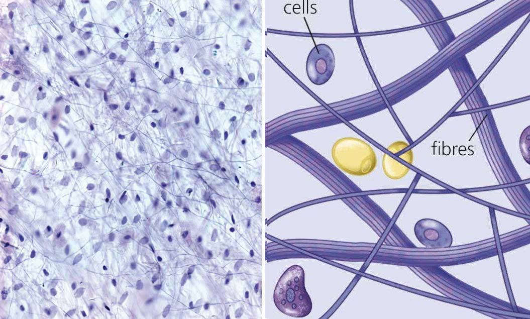 Connective tissue: located in the deepest layer of our skin, it constitutes the ‘stuffing’ between organs. The extracellular matrix contains many fibres, such as collagen.