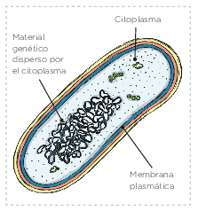 - Las células procariotas son las más pequeñas y sencillas y tienen el material genético disperso en el citoplasma. Por ejemplo, las bacterias son células procariotas.