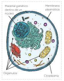 - Las células eucariotas, son más grandes y complejas. Tienen en su citoplasma unas estructuras llamadas orgánulos que realizan diferentes funciones. El material genético se encuentra protegido dentro de uno de estos orgánulos: el núcleo. Por ejemplo, los animales y las plantas están formados por células eucariotas.