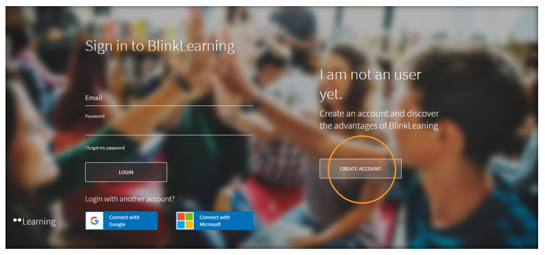 Access https://www.blinklearning.com from your web browser and click on LOGIN if you have an account to introduced your user and password, or click on CREATE ACCOUNT if you are not a BlinkLearning user yet.
