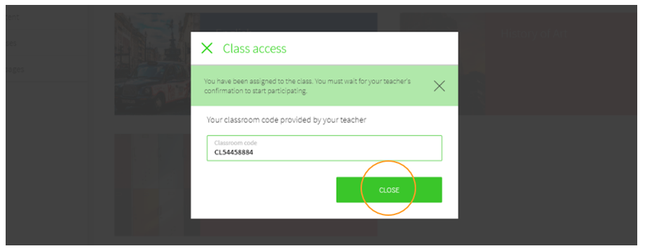 The following message will then be displayed and you will have to wait for your teacher to confirm your request to access the class. Simply click on CLOSE .