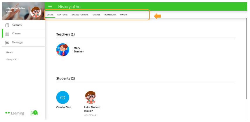 By accessing the class, you can see the users that are part of it, the contents assigned, the shared folders, your grades, your homework and a forum where you can see messages from your entire class.