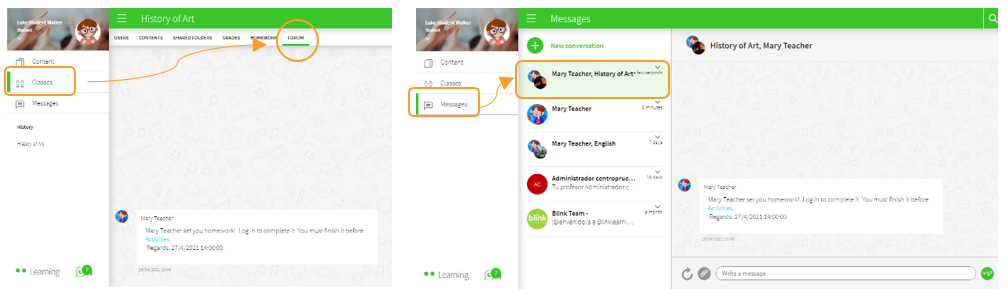 In the FORUM tab, you can check all the notifications from your classmates and teacher regarding your class. The notifications are also available in the Messages section.