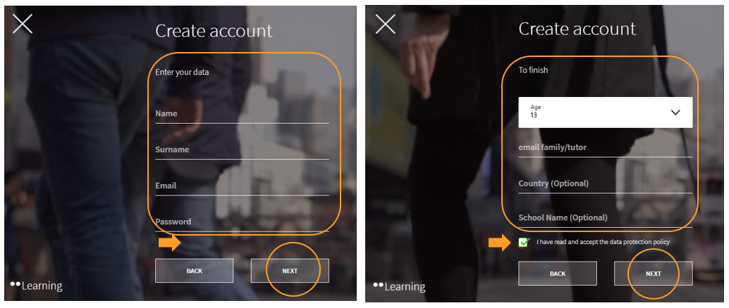 After that, you must complete the required fields in the registration form and click on NEXT . To finish, select your age (if you are under 14, the email of a family member or guardian will be required), accept the data protection policy and finally click on NEXT .