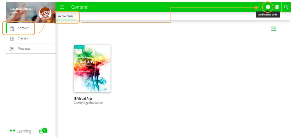 If you have new licence codes, you can add them to your profile at any time. To do so, go to the Content section, in the MY CONTENTS tab, and click on the + Add Licence Code button in the navigation bar.
