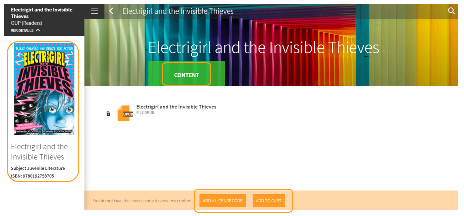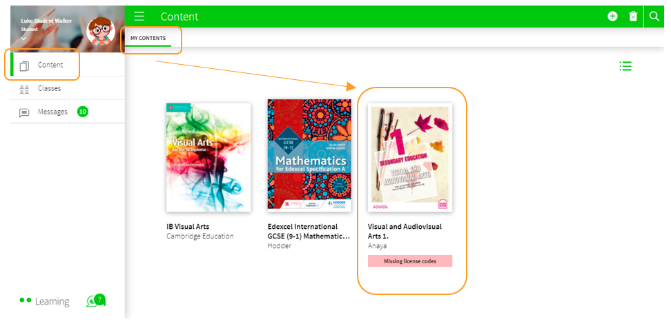 If you have joined a class and find a new book in the Content section and the MY CONTENTS tab, it means that the teacher has assigned that book to the class, you will need to add a licence code to activate it. You can easily recognise the book because it will be shown with a pink ribbon that reads 'Missing licence codes'.