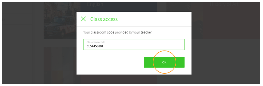Then enter the Class Code that should have been previously provided to you by your teacher and select OK .