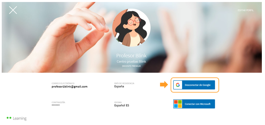 A continuación, entrarás a tu usuario de BlinkLearning. Comprueba que estás vinculado desde tu perfil, donde deberá aparecer Desconectar, esto es porque estás conectado.