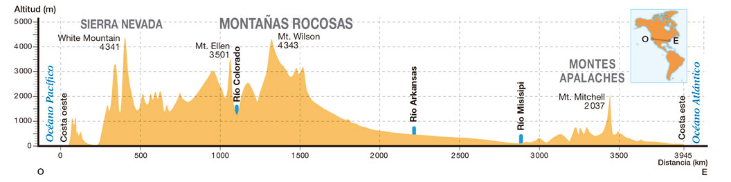 • El relieve de América se orienta de norte a sur. Las llanuras dominan en las regiones centrales y están recorridas por grandes ríos: Grandes Llanuras, Amazonas, Pampa argentina. Los macizos, o viejos relieves desgastados por la erosión, predominan en el este: escudos canadiense y de las Guayanas, montes Apalaches. Las cordilleras forman una alineación casi continua, extendida de norte a sur a lo largo de más de 12 000 km: Montañas Rocosas y cordillera de los Andes.