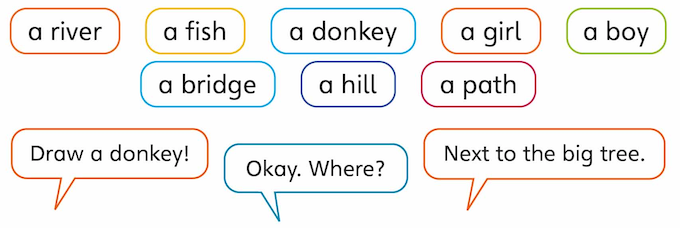 2 Work with a partner. Choose and tell them where to draw four more things.