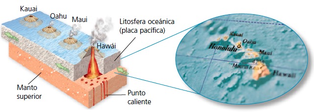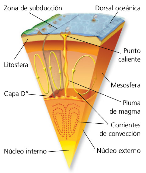 El calor del núcleo. Se acumula en la capa D" y origina corrientes de convección en la mesosfera y plumas de magma que dan lugar a los puntos calientes.