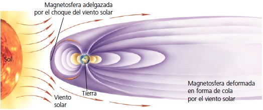 Magnetosfera. El campo magnético rodea a la Tierra y se extiende hasta el espacio exterior; constituye un invisible escudo protector de líneas curvadas de fuerza magnética que desvía el incesante bombardeo de las partículas energéticas procedentes del Sol, que constituyen el viento solar. El choque incesante de estas partículas de alta energía hace que la magnetosfera esté deformada.