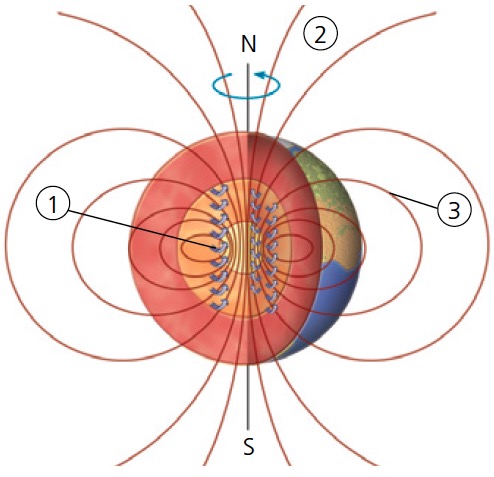 Los movimientos de los fluidos del núcleo externo son, además, la causa de otro importante fenómeno geológico: el campo magnético terrestre, denominado magnetosfera. La Tierra se comporta como un gigantesco imán que tiene dos polos, norte y sur y, como todo imán, genera un campo magnético formado por las líneas de fuerza que irradian de cada uno de los polos.