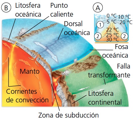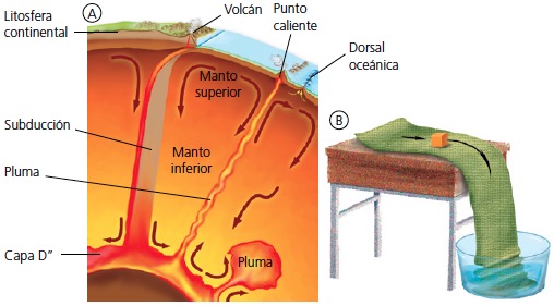 En el interior de la Tierra ocurre algo similar (B): las corrientes de convección se establecen entre el núcleo y el manto calientes y la litosfera fría. La causa es el calor interno de la Tierra.