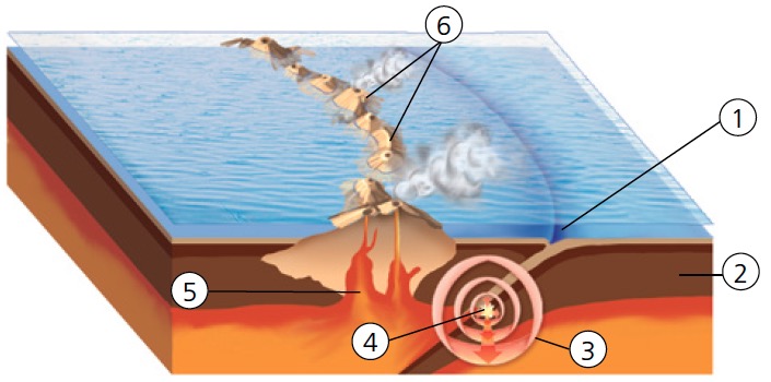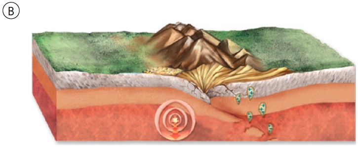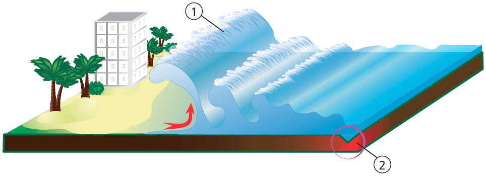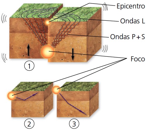 Ondas sísmicas. La energía se acumula en zonas rocosas sometidas a esfuerzos opuestos (1). Cuando se supera el límite de plasticidad, las rocas se fracturan, la energía se libera súbitamente en forma de vibraciones (2) y se originan ondas sísmicas P y S, que se propagan a partir del foco. Cuando estas ondas alcanzan el epicentro generan ondas L superficiales.