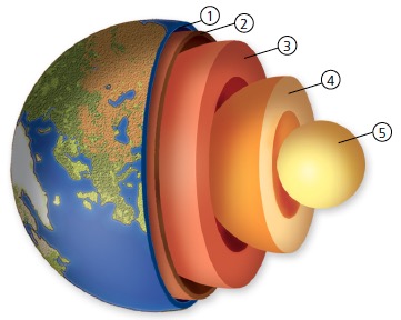 Estructura en capas de la Tierra. 1) Corteza. 2) Manto superior. 3) Manto inferior. 4) Núcleo externo. 5) Núcleo interno.