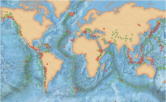 Mapa de distribución de los terremotos (● ) y de los volcanes (▲ ).