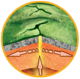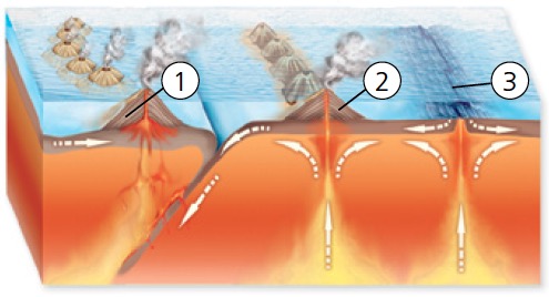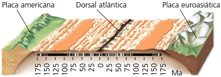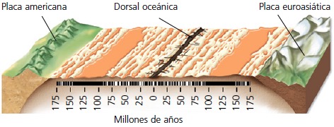 Para comprender los procesos geológicos que intervienen en la formación de las rocas basálticas del fondo de los océanos debes tener en cuenta los datos que suministra el paleomagnetismo, pues permiten averiguar la orientación de las rocas respecto de los polos magnéticos de la Tierra: el magnetismo registrado en los bloques de basalto oceánico se dispone en bandas de distinto grosor con orientaciones alternativamente invertidas, según la edad, y su distribución es simétrica con respecto al eje de la dorsal oceánica.