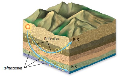 Reflexión. Cuando las ondas sísmicas chocan con una superficie que no pueden atravesar, «rebotan», y cambian de dirección.