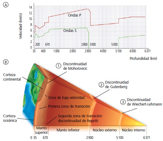 El interior de la Tierra no es homogéneo. El estudio de la propagación de las ondas sísmicas (A) permite deducir la estructura del interior de la Tierra (B) y pone de manifiesto que,a determinadas profundidades, se producen cambios bruscos de velocidad debido a la existencia de cuatro grandes discontinuidades: