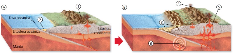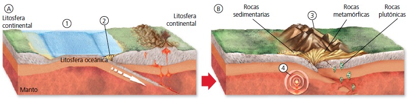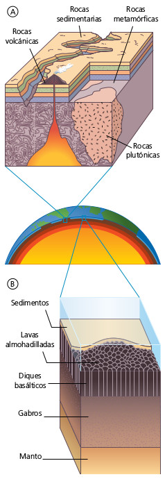 Estructura de la corteza: continental (A) y oceánica (B).