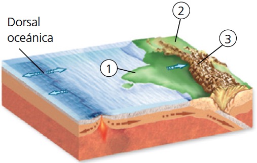 Placas litosféricas y sus bordes. La superficie del planeta se encuentra fragmentada en 14 grandes placas: pacífica, nazca, cocos, Juan de Fuca, norteamericana, sudamericana, caribe, euroasiática, africana, arábiga, filipina, indoaustraliana, scotia y antártica.