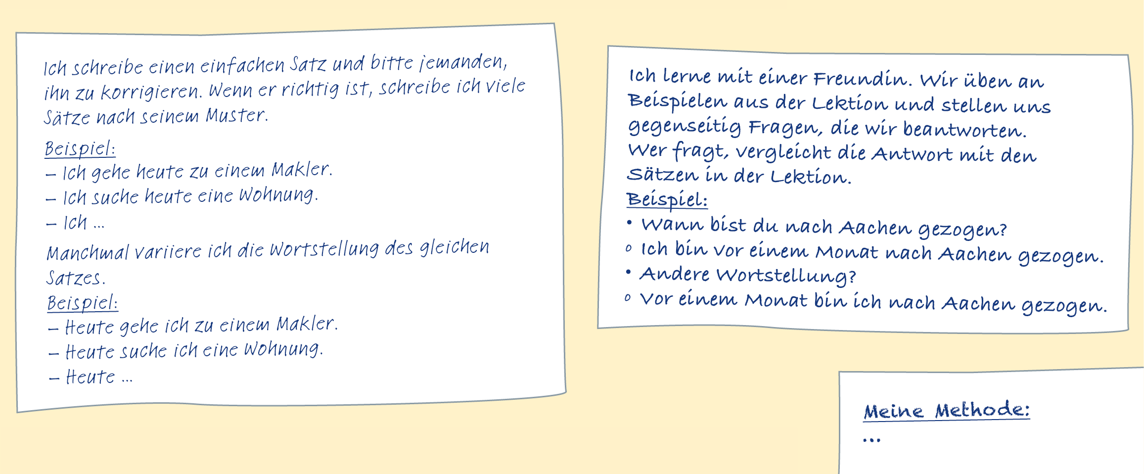 b Wie lernen Sie die deutsche Wortstellung? Schreiben Sie Ihre Lieblingsmethode auf, wie auf den Karten in 1a.