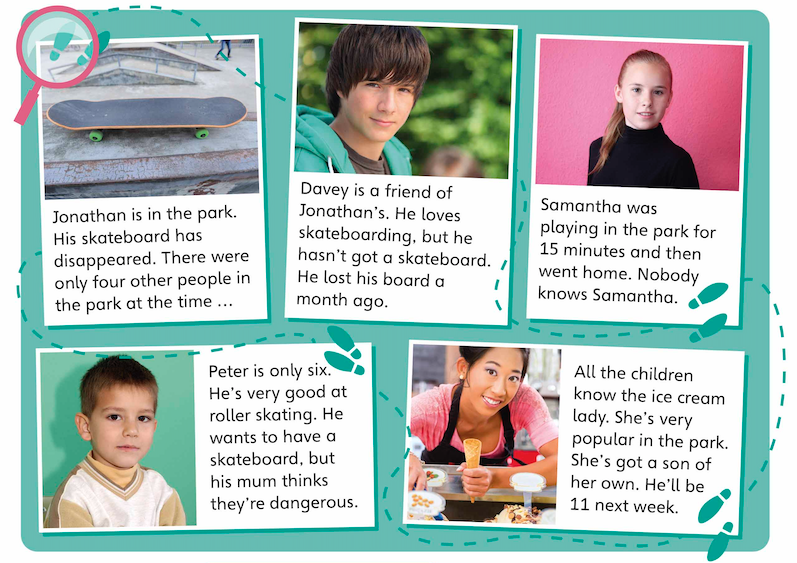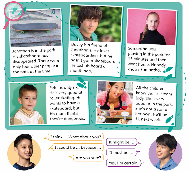 1 Work in pairs. Read the clues and talk about who you think has got Jonathan’s skateboard now. How certain are you? Who stole Jonathan’s skateboard?