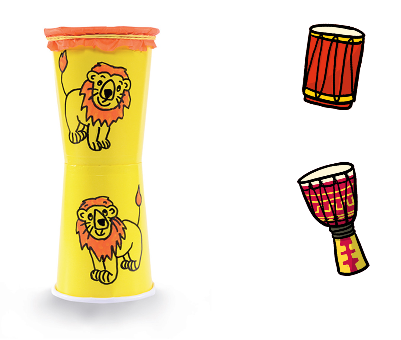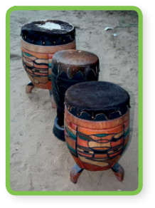 The djembe’s got a top part to play with your hands and a smaller bottom part to hold. The dundun is a large cylinder made from wood. The tama’s got strings around it that the musicians press and pull as they hit the drum with a stick. The musicians make the tama sound like somebody is talking.