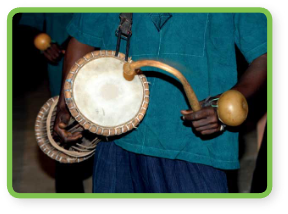 In Senegal, musicians get together to sing traditional stories about their history. Everybody joins in playing different instruments and singing. There are many different types of drums.