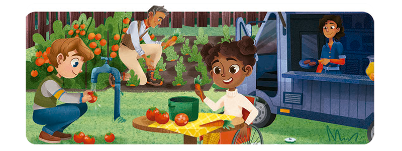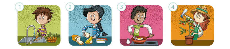 growing tomatoes making a sandwich washing a carrot cooking an egg