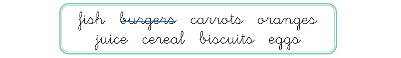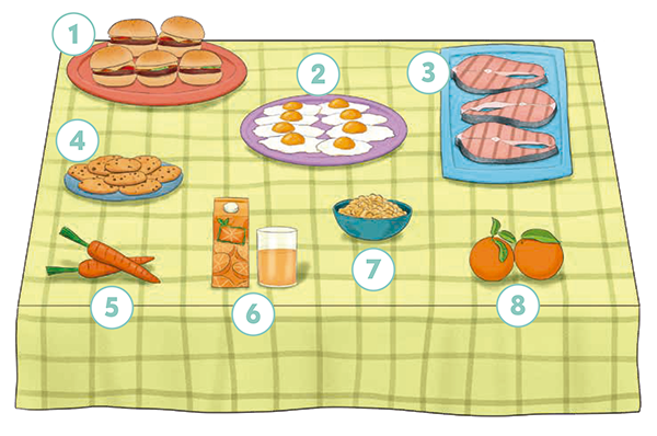 carrots cereal juice eggs oranges biscuits burgers fish