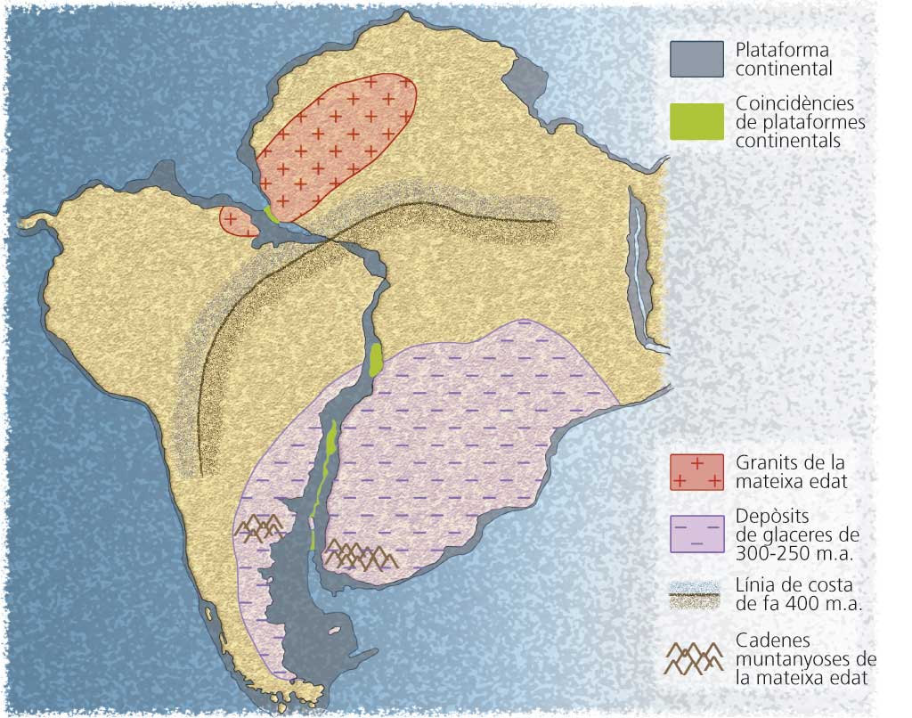 • Proves geològiques. Wegener va comprovar que l'encaix entre les costes millorava quan s'unien per les plataformes continentals. A més, ha constatat la continuïtat de nombroses estructures geològiques a un i a l'altre costat de la línia d'unió.
