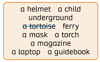 a helmet a laptop a torch a guidebook a child a mask a magazine ferry a tortoise underground