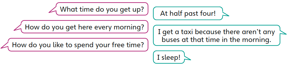 how she liked to spend her free time said she slept said she got a taxi, because there weren't any buses at that time of the morning how she got there every morning what time she got up said at half past four