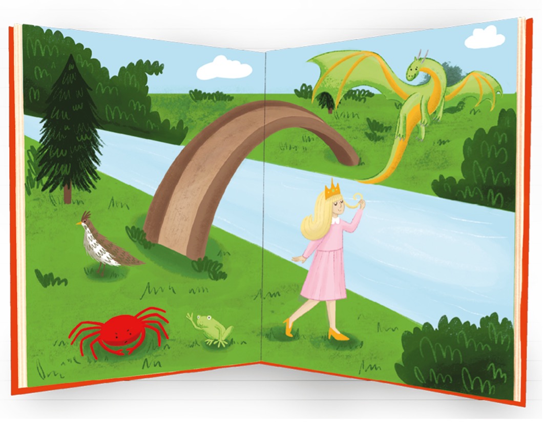 A grouse, a crab, a frog, a dragon, a princess,    bridge, a tree and grass growing all around.