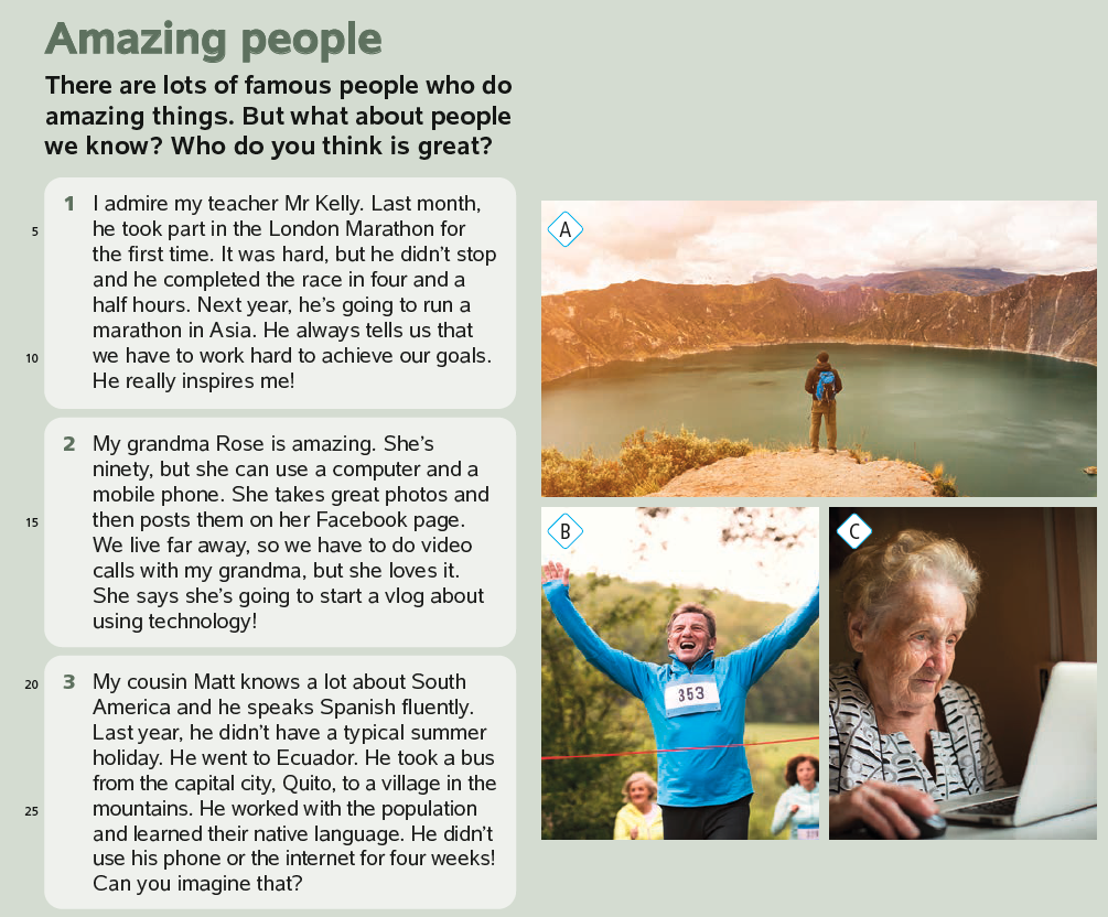 8 Describe the photos. What are the people doing? Read the posts quickly and match paragraphs 1–3 with people A–C.