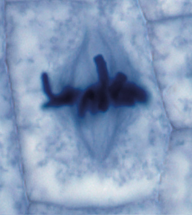 - Durante la metafase, los cromosomas, totalmente condensados y constituidos por dos cromátidas unidas por el centrómero, quedan alineados en el ecuador celular formando lo que se denomina placa ecuatorial o metafásica. Esta reorganización espacial es posible porque a nivel del centrómero de cada cromosoma se forma una estructura llamada cinetocoro, al que se unen filamentos del huso acromático.